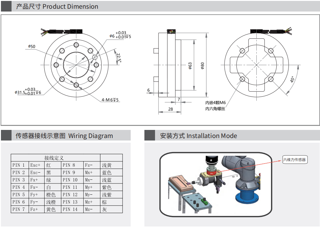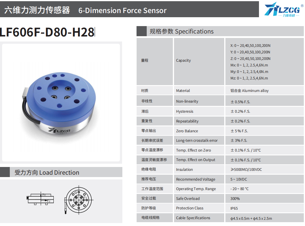 力准 LF606F-D80-H28 六维力传感器 机器人关节测力 20-200N